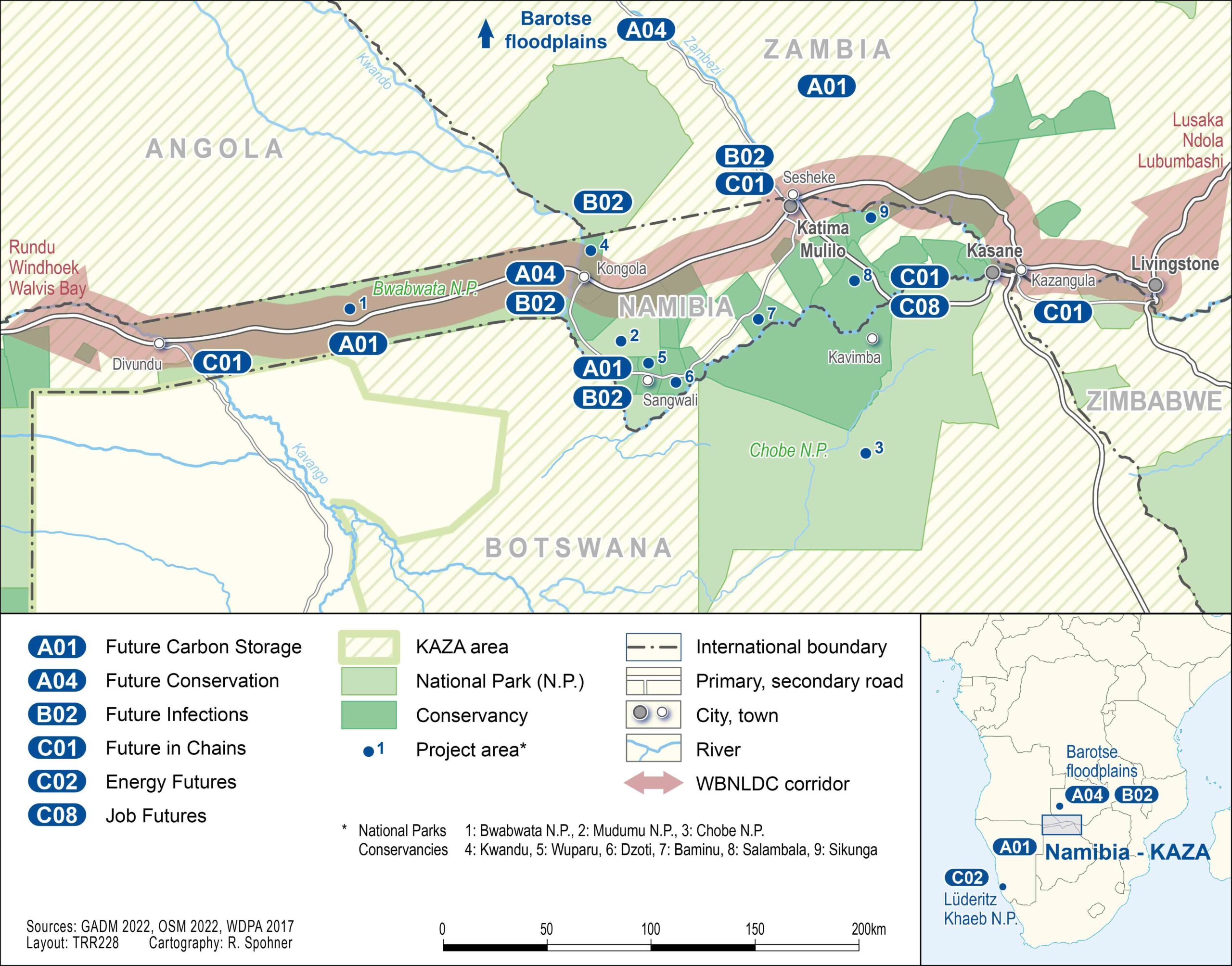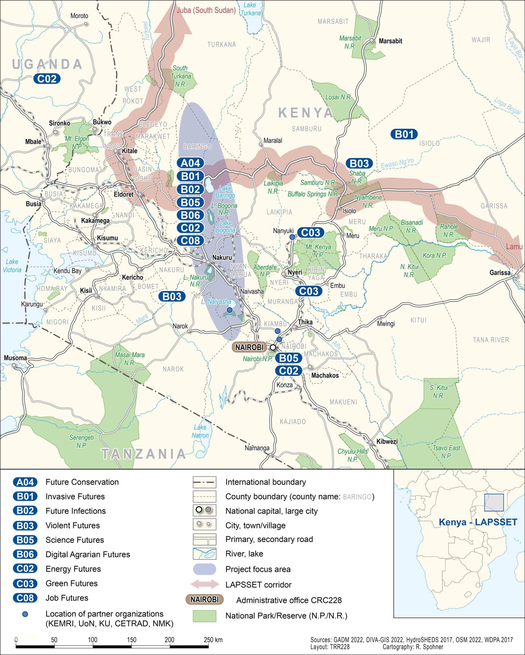 The CRC is structured in three project groups, each organized around a bridging concept that addresses specific aspects of SET and future-making. Project group A (‘coupling’) studies the articulation between social and ecological subsystems, B (‘boundaries’) looks at the shifting zones of interaction and confrontation, and C (‘linkages’) explores cross-scalar drivers, connections and causations. Empirical research focusses on development hubs in the Kenyan Rift Valley (KRV), the Southern Agricultural Growth Corridor of Tanzania (SAGCOT), and the Kavango Zambezi Transfrontier Conservation Area (KAZA). The CRC builds upon profound research experience from the applicants and African partners, amplifies the unique combination of expertise at the universities of Bonn and Cologne, fosters partnerships with scholars and scientific institutions in Africa, and aims at making Bonn-Cologne one of the leading centres of innovative research in the emerging field of futures studies and social ecology in Africa.